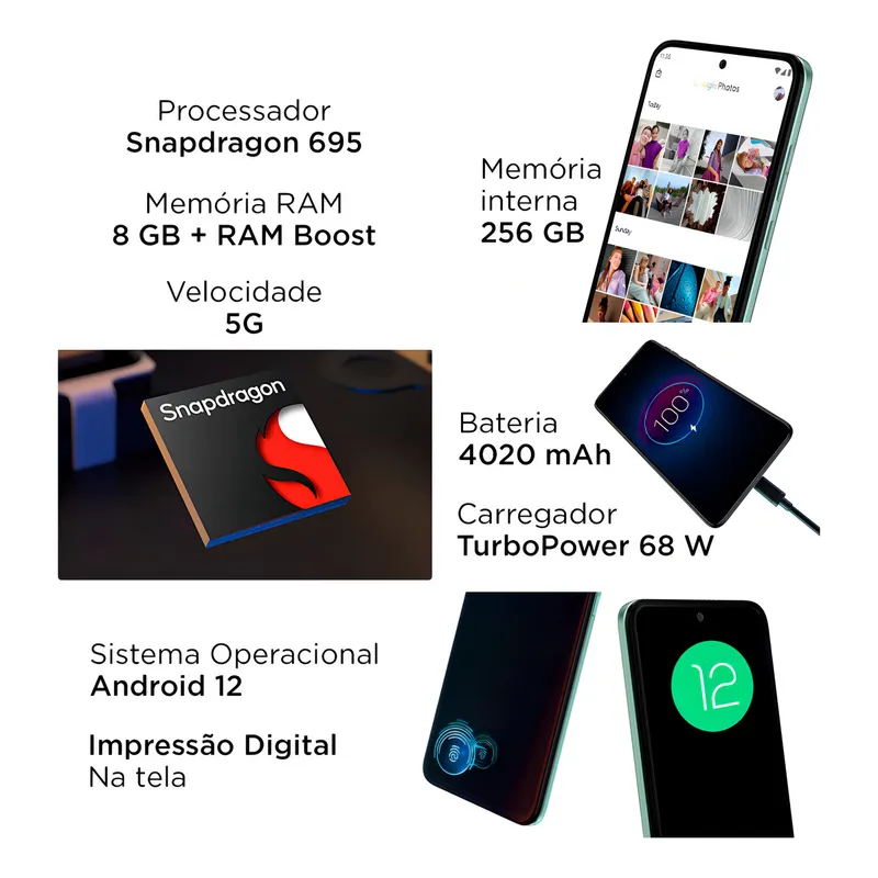 Processador Snapdragon 695 5G Octa-Core de 2.2GHz com 8GB de RAM.